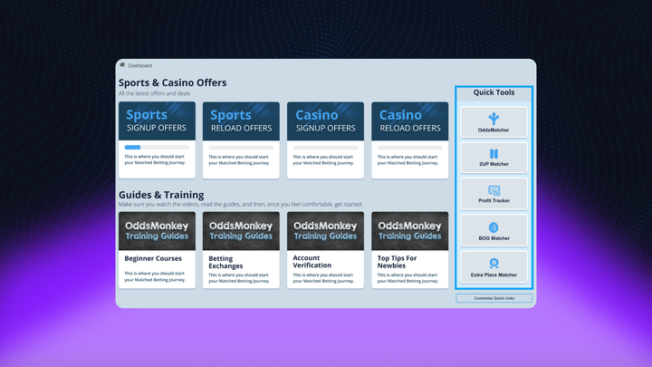 Alat dan fitur yang Anda andalkan, seperti panduan OddsMatcher dan Reload Offer kini lebih mudah ditemukan dan lebih cepat diakses.